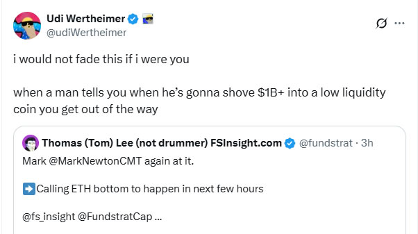 “Calling ETH bottom to happen in next few hours,” said Tom Lee on X on Tuesday at 1 am UTC as crypto markets saw red in the $200 billion market cap liquidation event