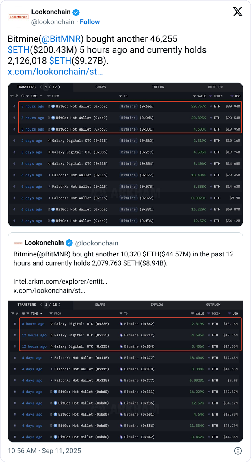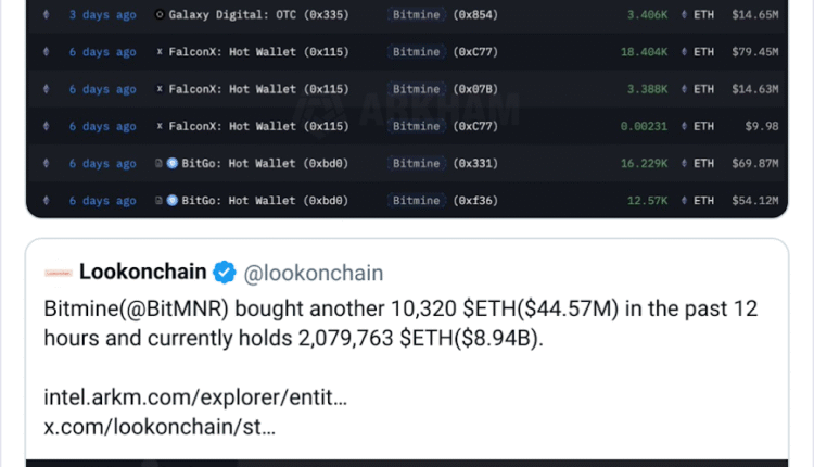 Blockchain data reviewed by Lookonchain shows BitMine purchased 46,255 Ether (ETH) across three transactions with Bitgo on Wednesday.