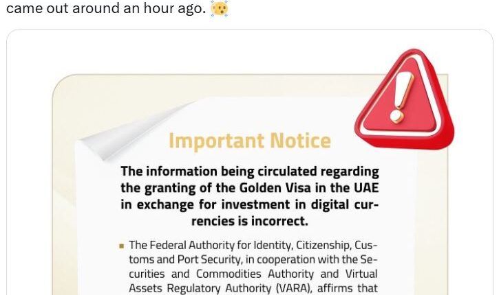 “The authority further confirmed that digital currency investments are governed by specific regulations and are unrelated to golden visa eligibility. It urged investors to obtain information from credible, official sources to avoid misinformation or fraud,” the Emirates News Agency reported.