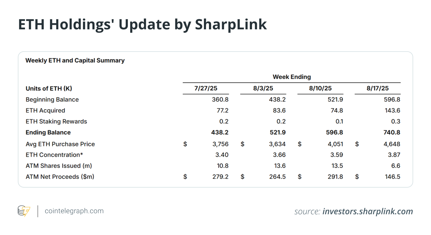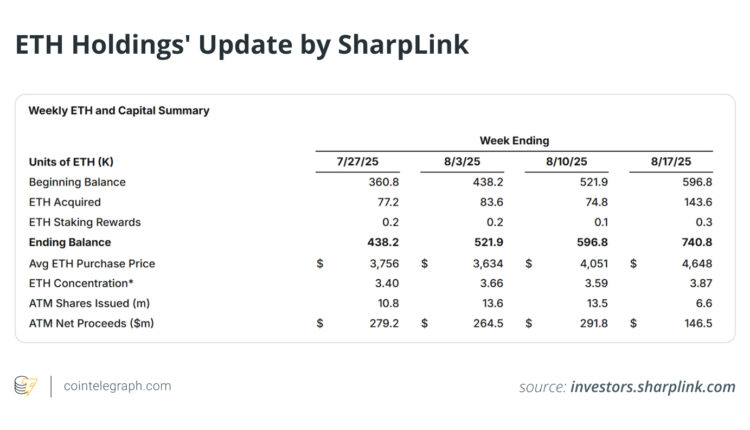 SharpLink’s investor update on Aug. 19, 2025, stated the company purchased 143,593 ETH in the prior week. This brought its total holdings to 740,760 ETH as of Aug. 17, 2025, with staking rewards continuing to accumulate.
