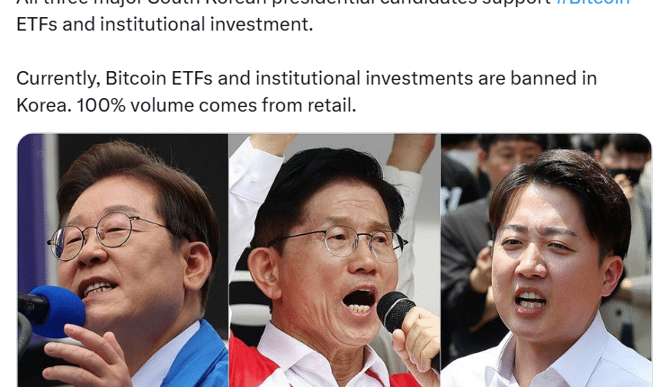 “All three major South Korean presidential candidates support #Bitcoin ETFs and institutional investment,” Ki Young Ju, the founder and CEO of onchain data platform CryptoQuant, wrote in a May 14 X post.