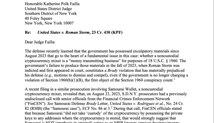 According to a May 16 letter from Storm’s attorneys to Judge Katherine Polk Failla, the FinCEN documents show that non-custodial crypto mixers do not fall under the legal definition of a “money transmitting business” and that prosecutors have known this since at least 2023.