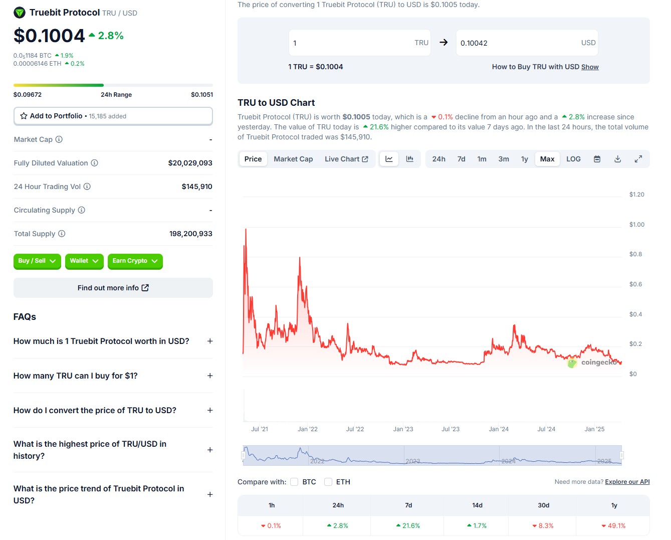 Truebit was launched in 2017 and launched its TRU token in 2021. The token has a fully diluted market capitalization of $20 million, according to CoinGecko.