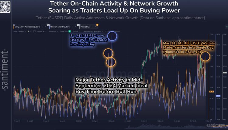 Data shared by the blockchain data platform Santiment in a March 12 X post shows Tether’s (USDT) onchain activity has been on the rise, peaking with over 143,000 wallets making transfers on March 11, the highest in six months.