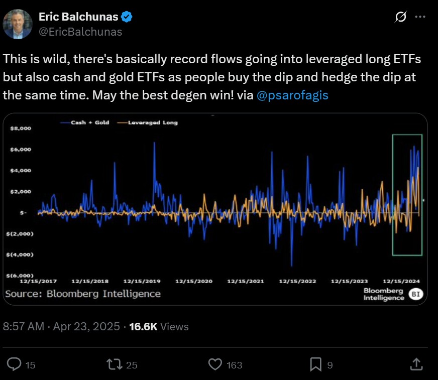 “[T]here’s basically record flows going into leveraged long ETFs but also cash and gold ETFs as people buy the dip and hedge the dip at the same time. May the best degen win!,” Bloomberg Intelligence analyst Eric Balchunas said in an April 23 post on the X platform.