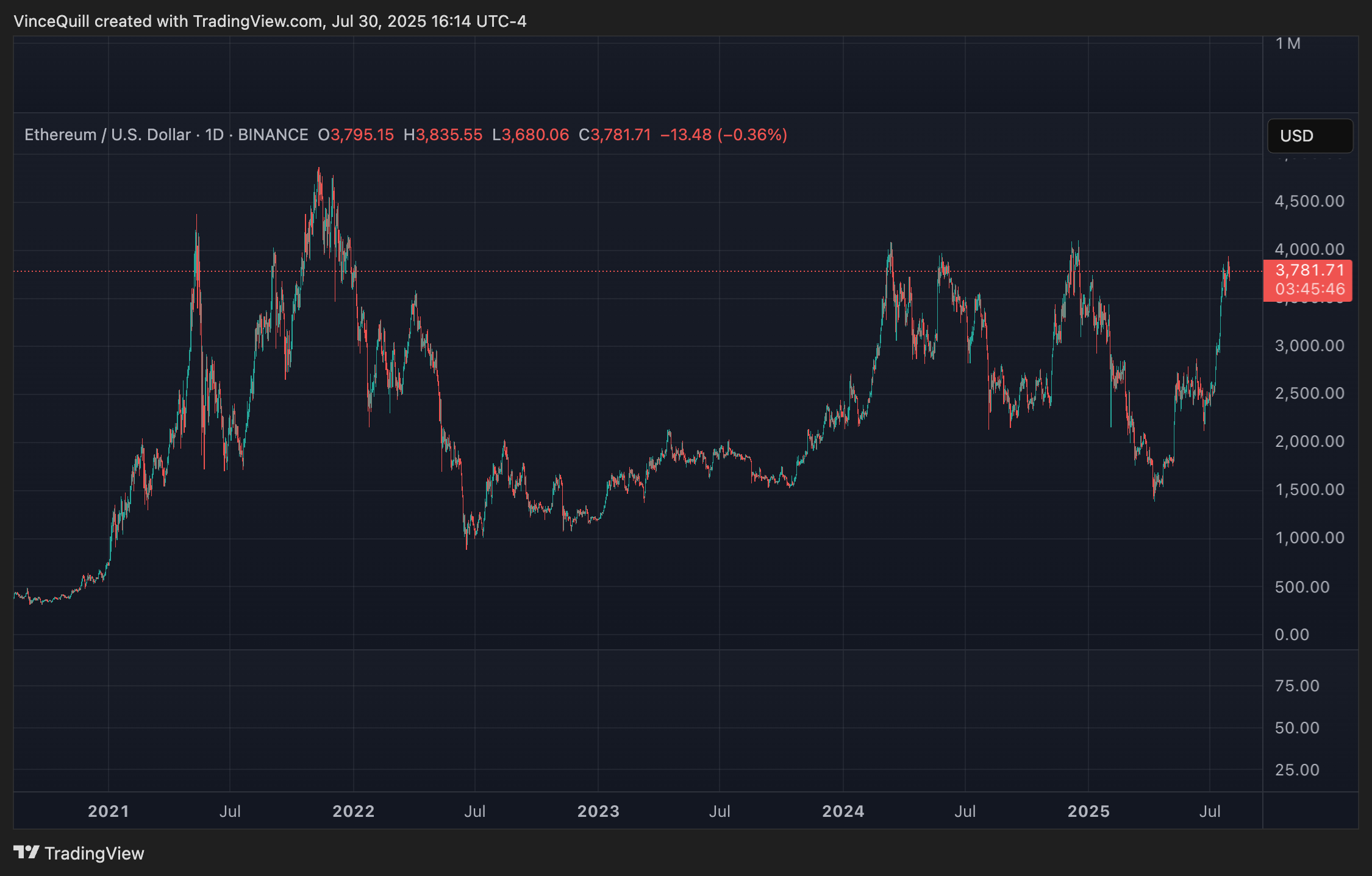 Ether, like all cryptocurrencies, experiences high volatility and rapid price swings. Source: TradingView