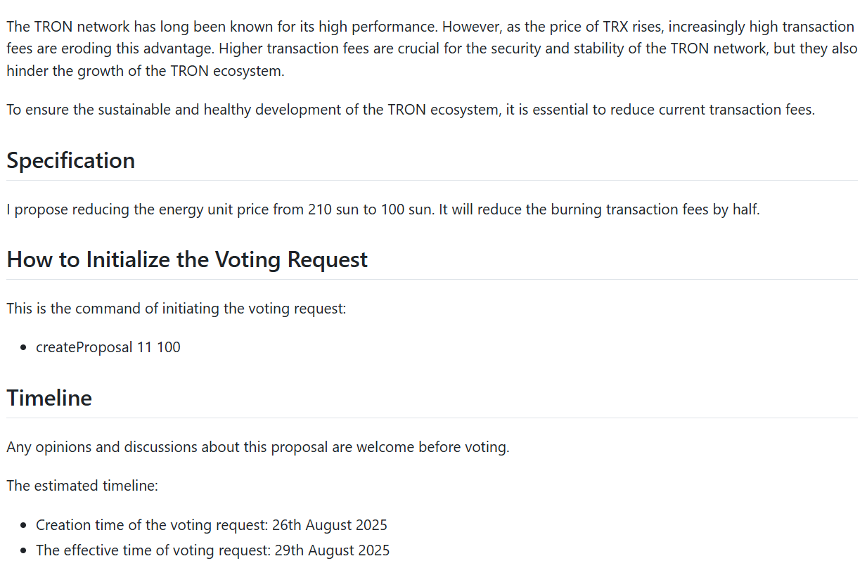 The proposal, titled “Decrease the transaction fees” (Issue #789), was submitted on Aug. 8 by GitHub user GrothenDI in the Tron Improvement Proposals repository.
