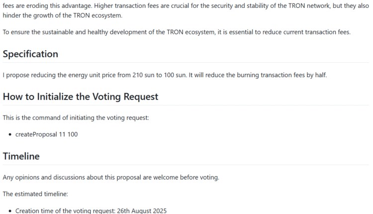 The proposal, titled “Decrease the transaction fees” (Issue #789), was submitted on Aug. 8 by GitHub user GrothenDI in the Tron Improvement Proposals repository.