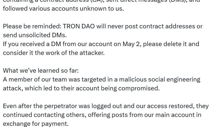 After regaining access, Tron DAO said in a May 2 X update that they suspect the hack resulted from a team member being “targeted in a malicious social engineering attack, which led to their account being compromised.”