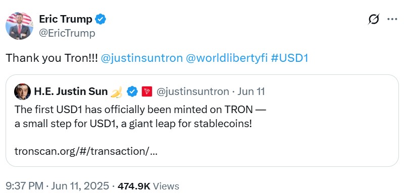 What surprised many market watchers about Tron’s public listing plan was the reported involvement of Eric Trump, son of US President Donald Trump, in the new TRX treasury firm.