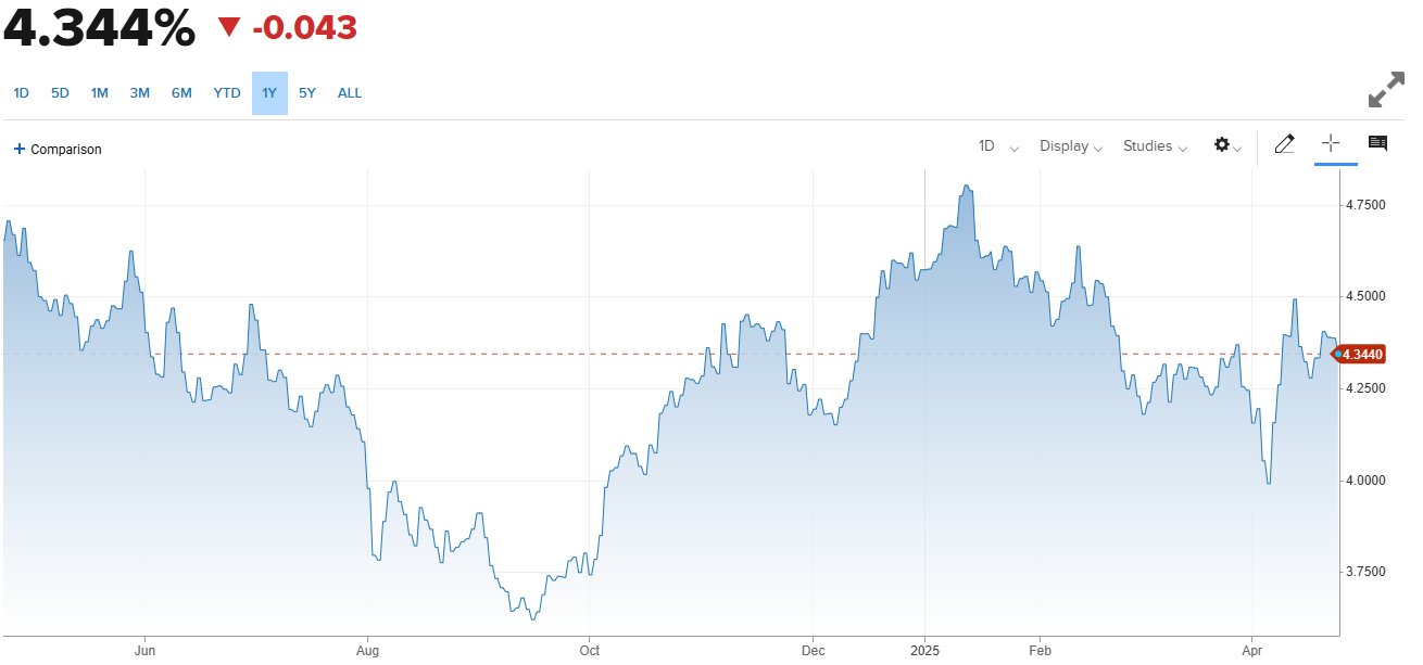 Following Trump’s tariff announcement, CNBC data shows that the 10-year Treasury yield surged from under 4% to 4.5% amid a sell-off driven by inflation and recession concerns.
