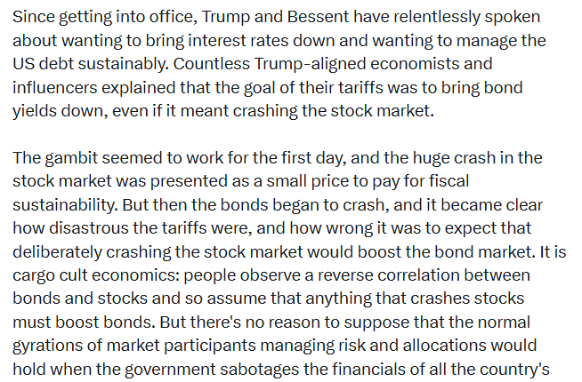 “But then the bonds began to crash, and it became clear how disastrous the tariffs were, and how wrong it was to expect that deliberately crashing the stock market would boost the bond market,” he added.