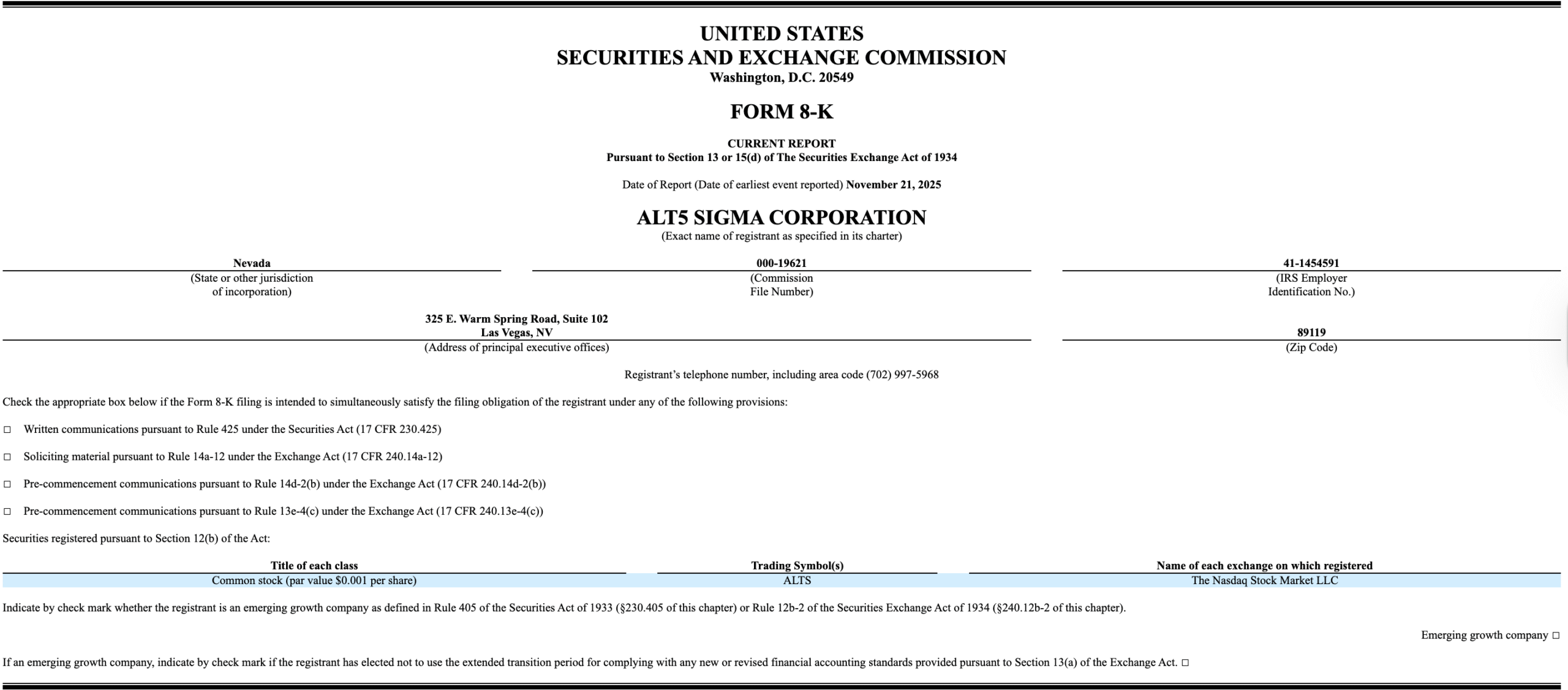 ALT5 Sigma’s crypto treasury strategy includes purchasing tokens from World Liberty Financial (WLFI), a decentralized finance platform tied to the Trump family.
