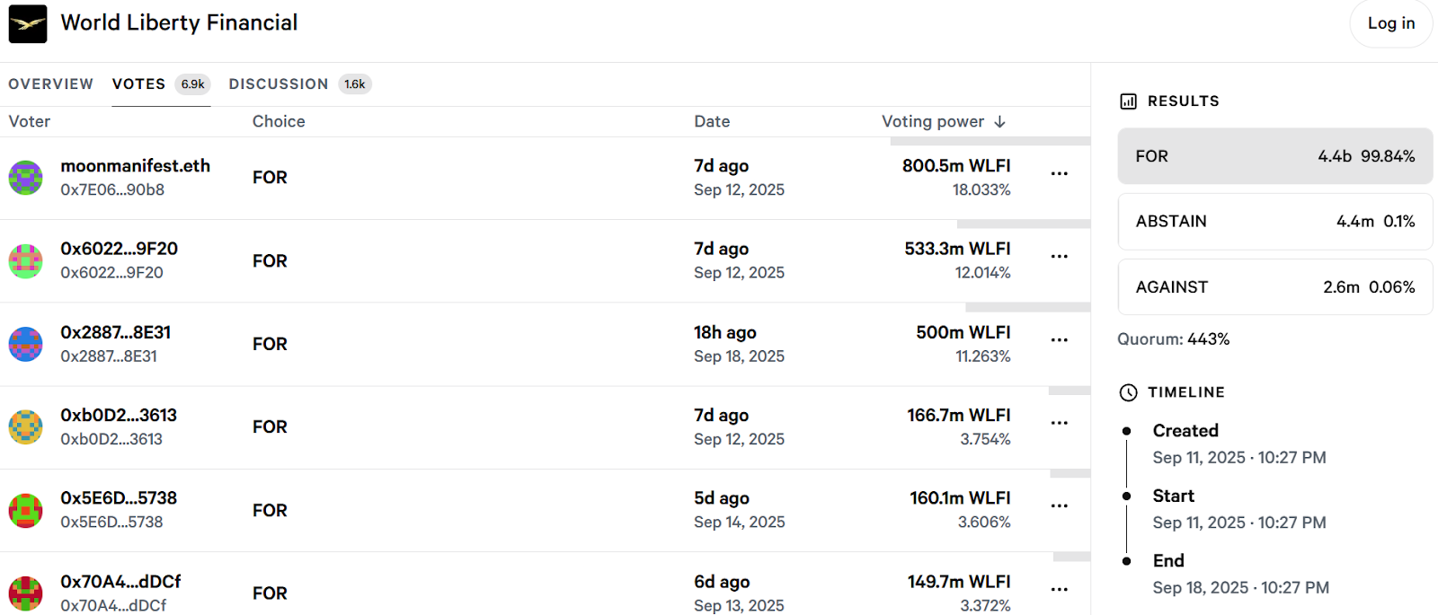 The vote passed with a 99.8% majority, while only 0.06% of the community voted against the proposal, which will serve as the “foundation” of the platform’s token buyback strategy, according to data from WorldLibertyFinancial.com.