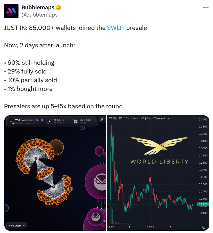 Out of more than 85,000 pre-sale participants, 60% were still holding the token, while only 29% had fully sold, wrote blockchain data platform Bubblemaps, in a Wednesday X post.