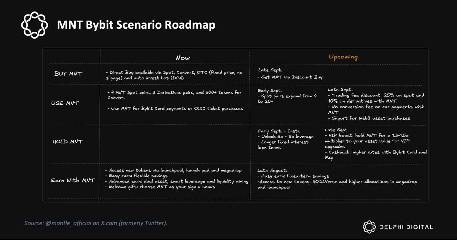 On Aug. 29, Bybit exchange and Mantle revealed a combined roadmap, which awarded MNT holders lower slippage buys, more payment options within the Bybit ecosystem and other savings and staking products.