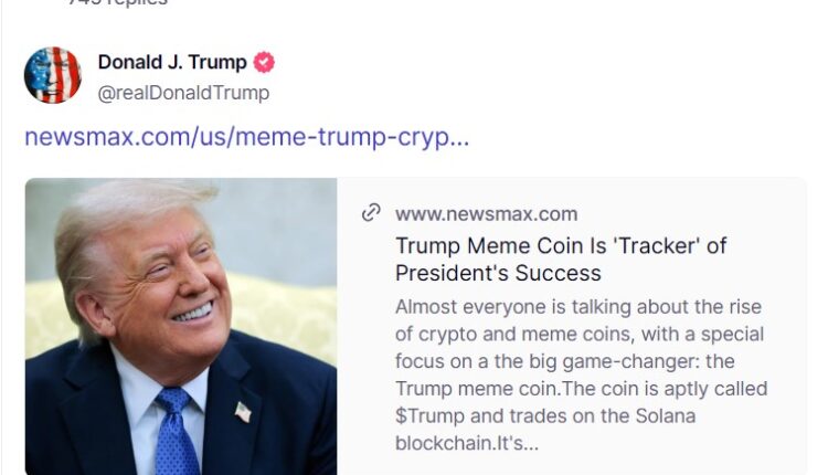 Donald Trump shares an article discussing memecoin as a success tracker. Source: Donald Trump