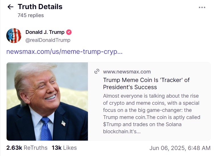 In a post on his social media platform Truth Social, Trump shared a Newsmax article discussing how his official cryptocurrency token serves as a gauge of political momentum, echoing views shared by some crypto industry figures.