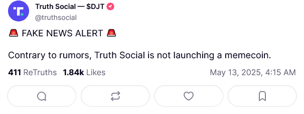 Truth Social, the social media network owned by Trump Media, has denied it is launching a memecoin following circulating rumors on social media.