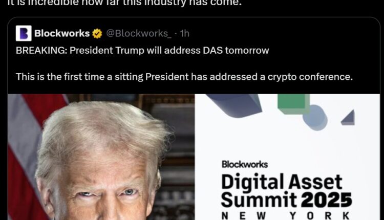 United States President Donald Trump will reportedly speak at Blockworks’ Digital Asset Summit in New York on March 20, Blockworks said.