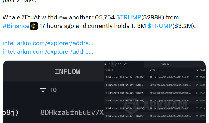 One whale withdrew about 105,754 TRUMP from Binance on Saturday to add to its stash of 1.13 million TRUMP, worth about $3.2 million, according to blockchain analytics firm Lookonchain said in an X post on Sunday.