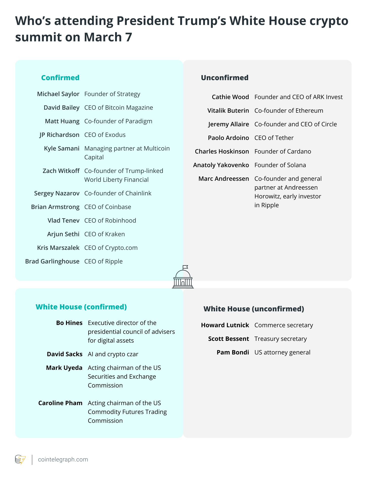 As US President Donald Trump prepares to host the first White House Crypto Summit on March 7, the industry is watching closely to see who will be invited.