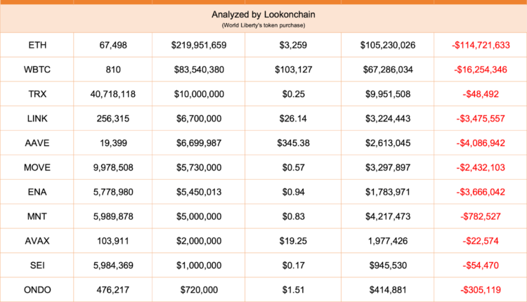 World Liberty Financial’s current on-paper profit/loss on its altcoins. Source: Lookonchain