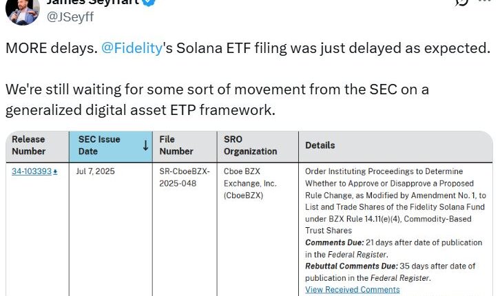 Meanwhile, the SEC has delayed making a decision on Fidelity’s proposed spot Solana (SOL) ETF, opening up a new public comment window with responses requested within 21 days and rebuttals within 35 days.