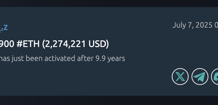 Two Ethereum wallets dormant for nearly a decade were activated on Monday, moving a combined 1,140 Ether tokens worth nearly $2.9 million.
