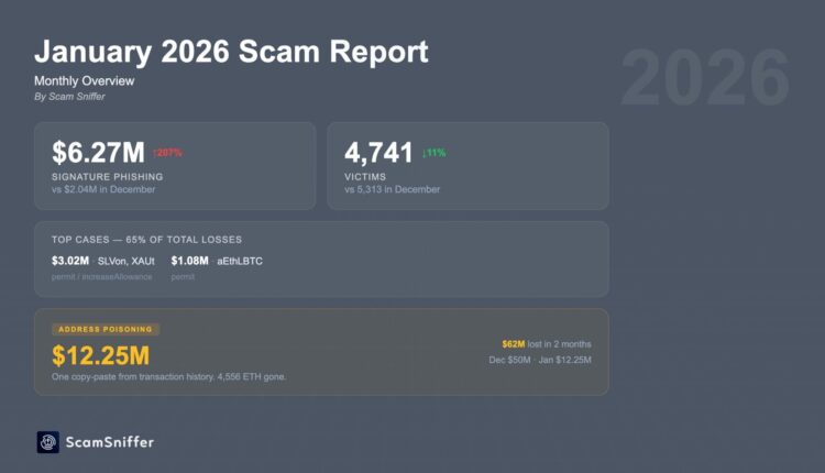 Scam Sniffer added that signature phishing also surged recently, with $6.27 million stolen from 4,741 victims in January, a 207% increase compared to December.