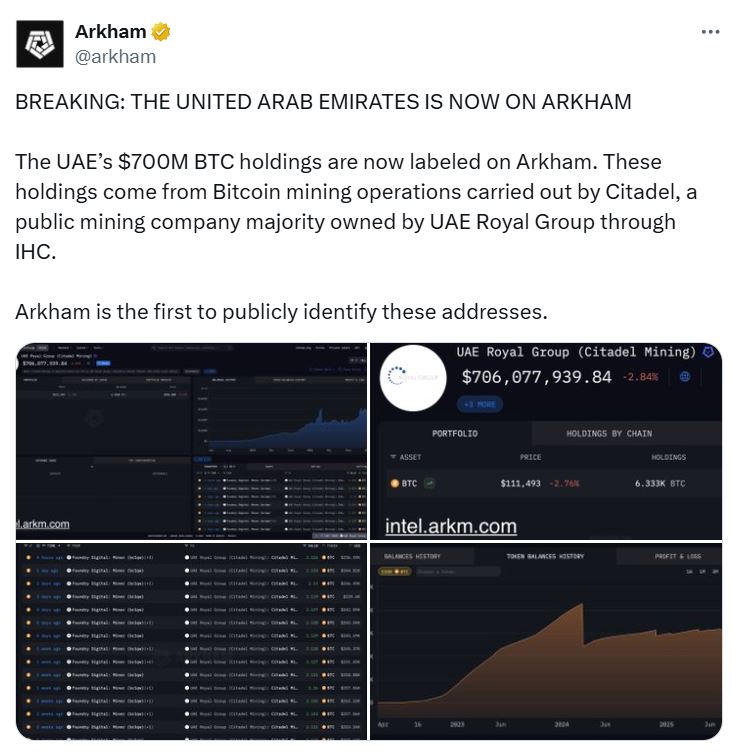 Arkham said in an X post on Monday that it has become one of the first to publicly identify the UAE government’s wallets, finding that their wallet addresses hold about 6,300 Bitcoin (BTC).