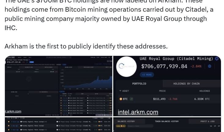 The United Arab Emirates (UAE) holds about $700 million in Bitcoin, which has been accumulated mostly from mining operations, according to the blockchain analytics platform Arkham Intelligence.