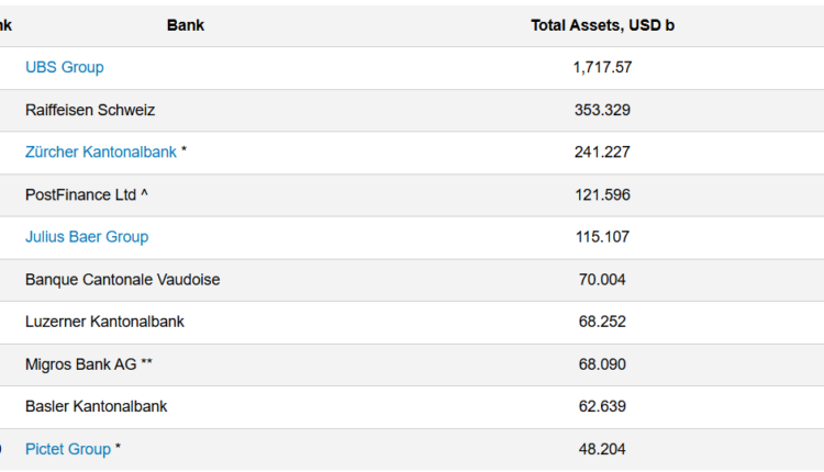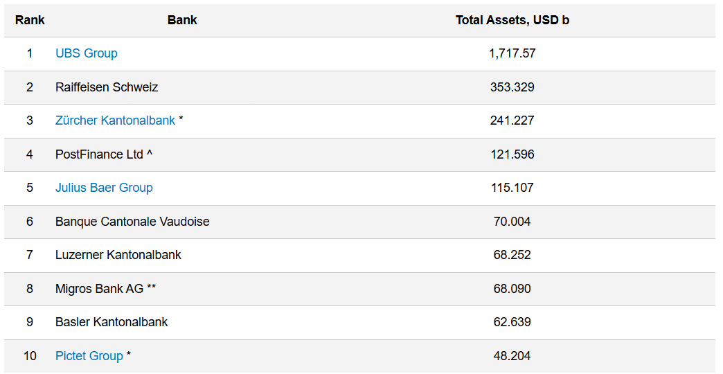 UBS Group is the largest Swiss bank with $1.7 trillion in total assets, followed by Raiffeisen Schweiz with $353 billion, Zürcher Kantonalbank with $241 billion and PostFinance with $121 billion, according to data from Advratings.