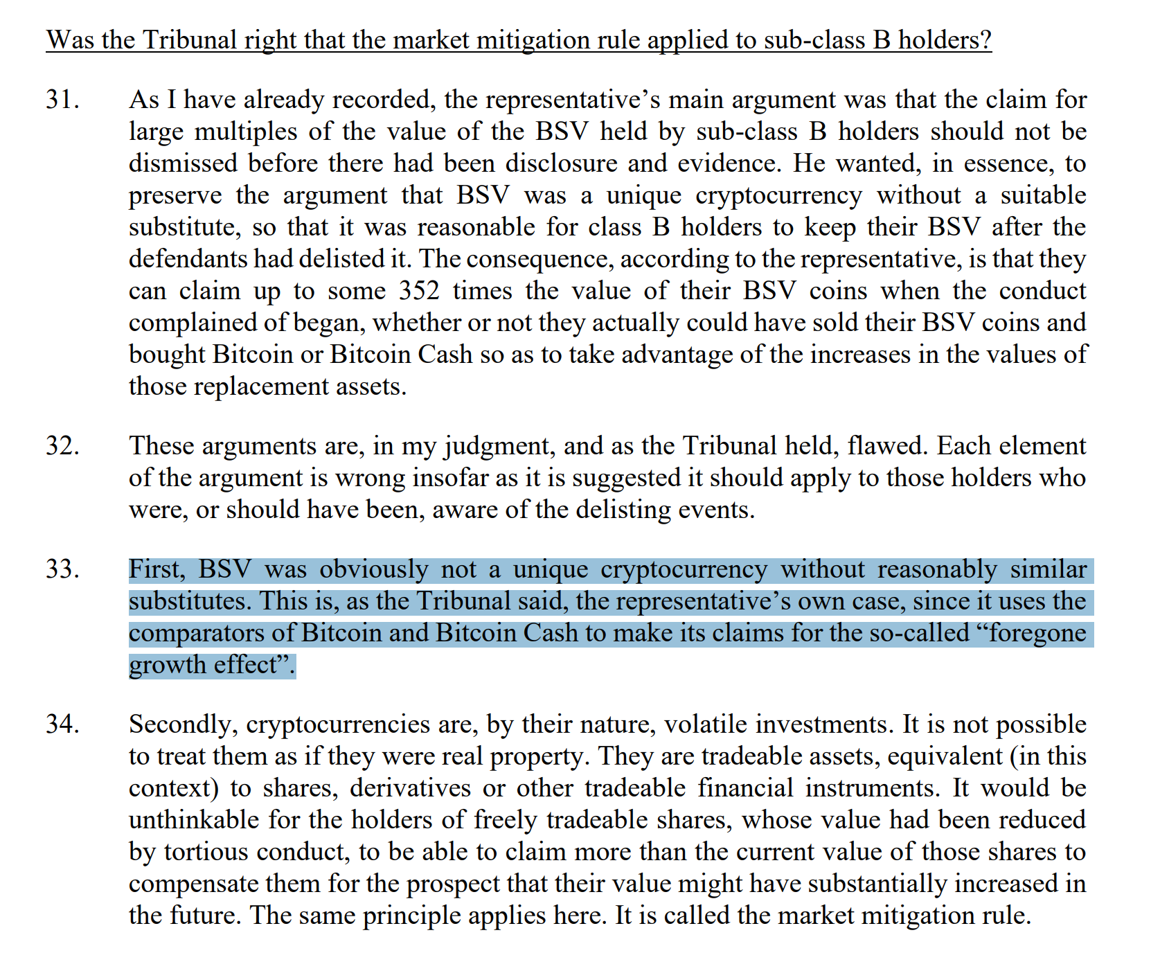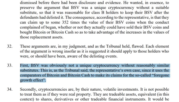The court rejected this “foregone growth effect” theory, stating, “BSV was obviously not a unique cryptocurrency without reasonably similar substitutes,” pointing to the representative’s own use of Bitcoin and Bitcoin Cash as comparators.