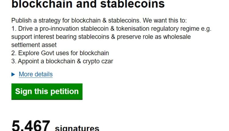 The petition, hosted on the UK government’s website, calls for a comprehensive framework that includes stablecoin regulation, blockchain adoption and the appointment of a blockchain “czar.”