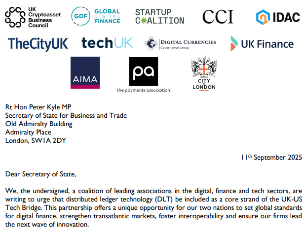 The initiative follows Trump’s embracing of blockchain technology and cryptocurrencies during his second term in the White House. The letter reads that “excluding digital assets from the UK-US Tech Bridge would be a missed opportunity,” and adds: