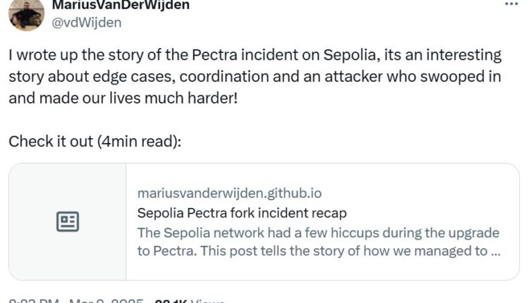 An Ethereum developer says the recent Pectra upgrade of the Sepolia testnet ran into errors, which was made worse after an attacker used an “edge case” to cause the mining of empty blocks.