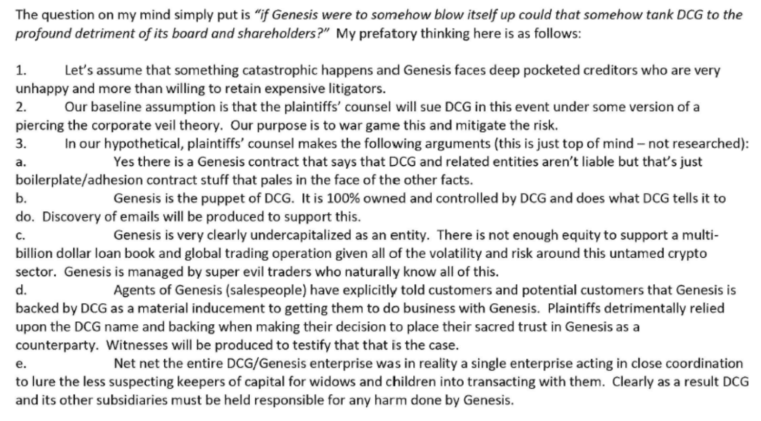 “The question on my mind simply put is ‘if Genesis were to somehow blow itself up could that somehow tank DCG to the profound detriment of its board and shareholders?’ My prefatory thinking here is as follows,” Kraines wrote to Moro, indicating they were preparing for an imminent legal fallout.