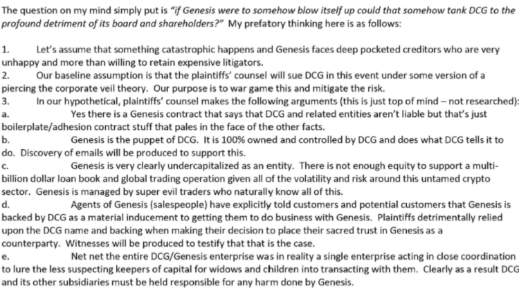 “The question on my mind simply put is ‘if Genesis were to somehow blow itself up could that somehow tank DCG to the profound detriment of its board and shareholders?’ My prefatory thinking here is as follows,” Kraines wrote to Moro, indicating they were preparing for an imminent legal fallout.