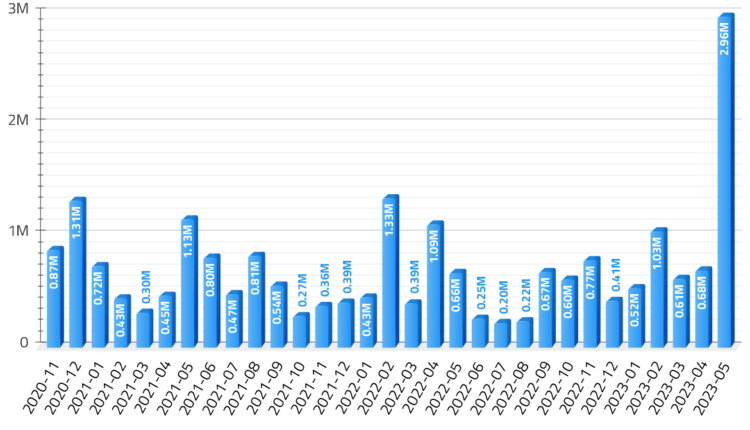 The number of staked Ether (ETH) in May reached a new all-time high of 2.96 million ETH, approximately 2.46% of the total supply.