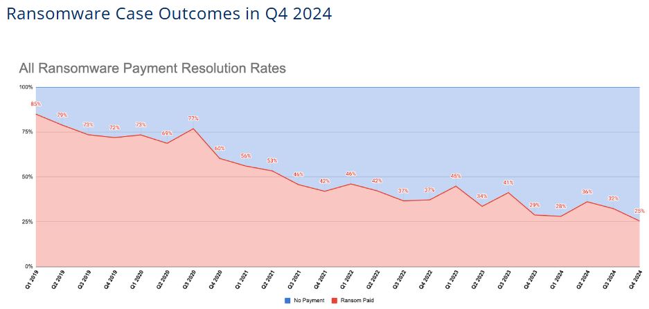 Fewer companies are giving in to criminals’ demands, with a February report from cyber incident response firm Coveware finding that only 25% of companies hit with extortion demands in the last quarter of 2024 paid the ransom.