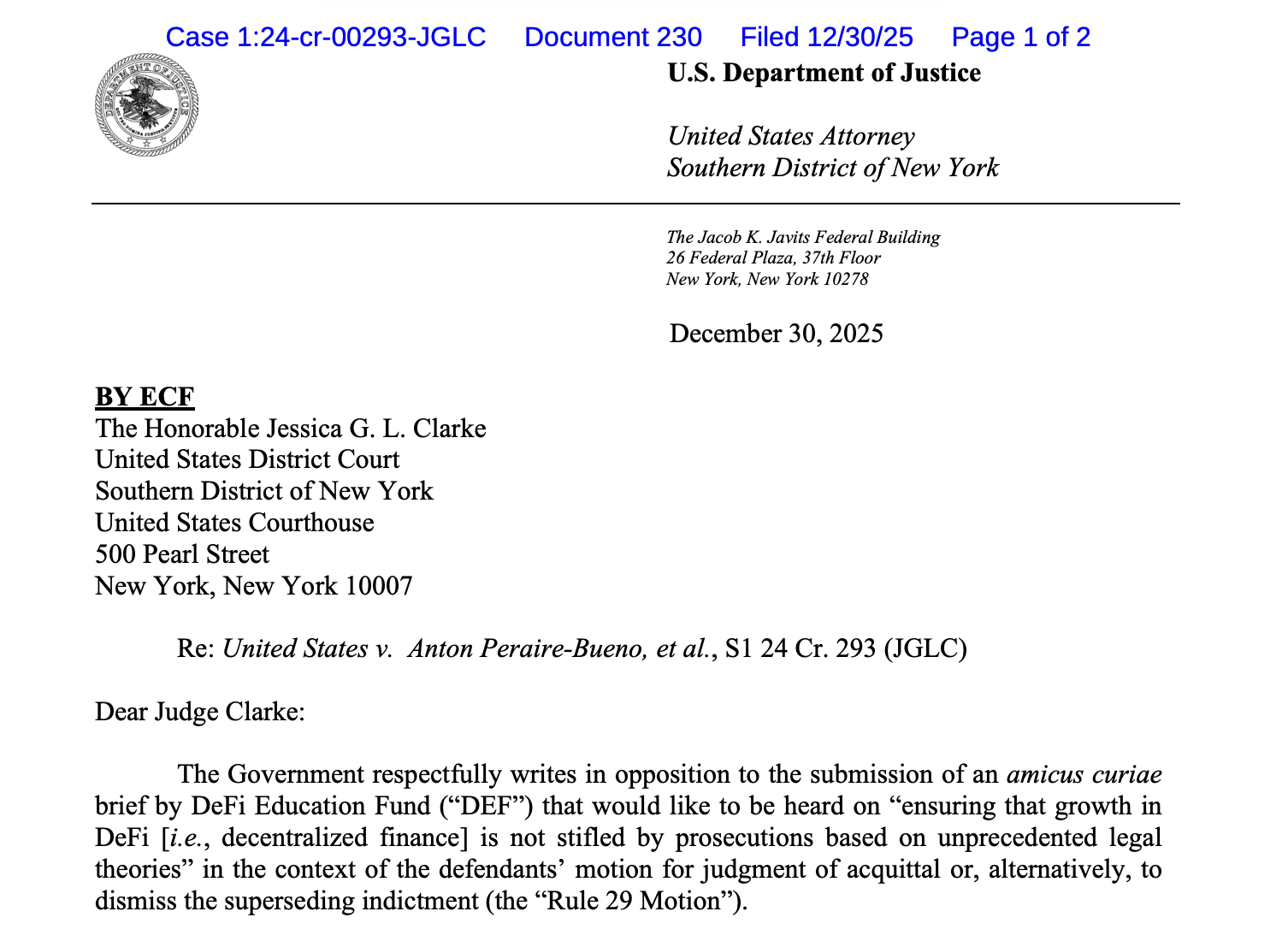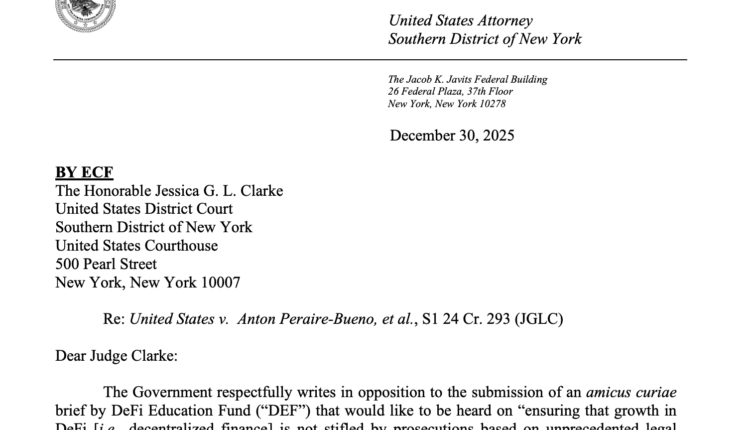 In a Tuesday filing in the US District Court for the Southern District of New York, interim US Attorney Jay Clayton submitted a letter to Judge Jessica Clarke requesting that a brief from the DeFi Education Fund (DEF) not be accepted while the court considers a motion to dismiss the case against Anton and James Peraire-Bueno.