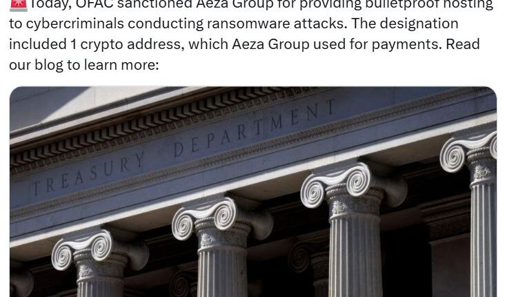 OFAC sanctioned a Tron blockchain address that was an administrative wallet, handling cash-outs from Aeza’s payment processor, forwarding funds to various crypto exchanges and occasionally receiving direct payments for Aeza’s services, blockchain analytics firm Chainalysis said on Tuesday.