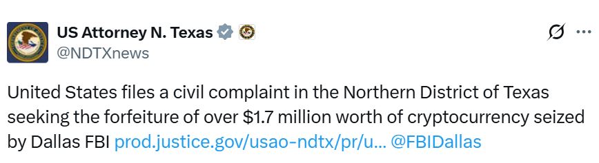The United States has filed a civil complaint seeking the forfeiture of $2.4 million in Bitcoin seized by the Dallas FBI, bolstering the proposed US Strategic Bitcoin Reserve.