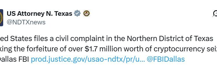 The United States has filed a civil complaint seeking the forfeiture of $2.4 million in Bitcoin seized by the Dallas FBI, bolstering the proposed US Strategic Bitcoin Reserve.