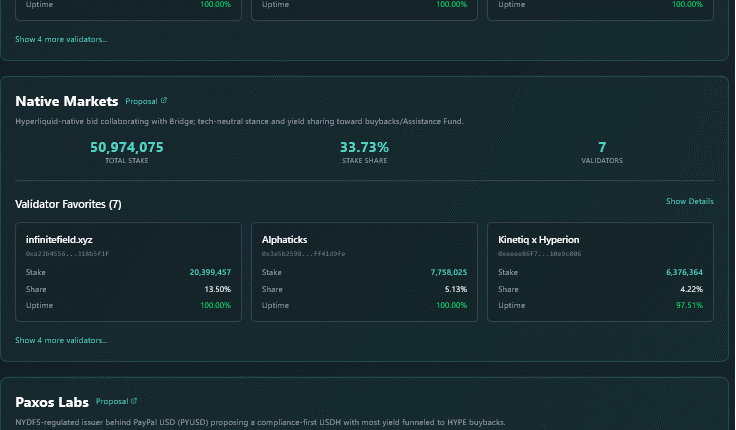 Hyperliquid validators will start voting for the USDH proposal from Thursday and will be able to cast their votes until Sunday. Other suitors include Ethena, Paxos, Frax, Agora, Native Markets and Sky.