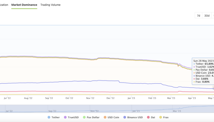In the past 12 months, Circle’s USD Coin (USDC) has seen its market share decline from 34.88% to 23.05% at the time of writing. Market participation of Binance USD (BUSD) plunged from 11.68% to 4.18% in the same period, while Dai (DAI) held its participation rate at 3.66%, down from 4.05% in May 2022.