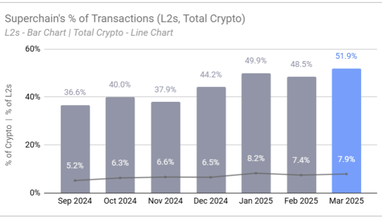 Superchain is a network of layer-2 chains designed to scale Ethereum through Optimism’s OP Stack. The collective currently accounts for 52% of Ethereum layer-2 transactions, according to data tracked by Superchain.