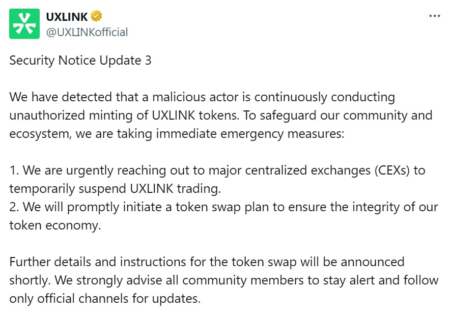 In response to the unauthorized token mints, UXLink publicly reached out to centralized exchanges (CEXs) to temporarily suspend trading of its token. The company also said it will initiate a token swap plan to protect its ecosystem.