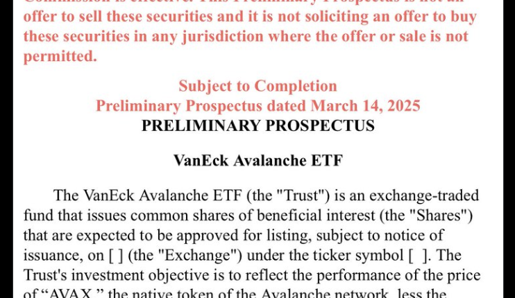 The proposed VanEck Avalanche ETF intends to “reflect the performance of the price of “AVAX,” the native token of the Avalanche network, less the expenses of the Trust’s operations,” the prospectus read.